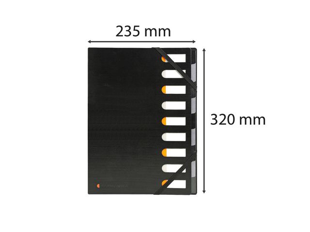 Sorteringsmappen Harmonika® Exactive® ger dig möjlighet att enkelt arkivera många dokument på ett strukturerat sätt. Sorteringsmappen Exacompta Harmonika® Exactive® med 9 fack och en utdragbar rygg erbjuder generöst lagringsutrymme på 450 ark A4-papper. Den här mappen har utskurna fönster på framsidan för enkel indexering och flikavdelare för kategorisering av innehållet. Den har dessutom 2 gummiband gör att mappen stängs ordentligt. Det finns också 2 fickor på insidan med skåror för förvaring av exempelvis CD-skivor och visitkort. Den här eleganta sorteringsmappens omslag är tillverkat av innovativ 80 % återvunnen polypropylen, medan kartong om 225 g/m² används för invändiga material. Det högkvalitativa materialet gör den här praktiska sorteringsmappen till en tålig, lätt och miljövänligare lösning för dina arkiveringsbehov. – Förvaringskapacitet: Rymmer 450 A4-papper – 9 fack med en utdragbar rygg för arkivering med hög kapacitet – Utskurna fönster på framsidan för indexering – Flikavdelare för kategorisering av innehåll – Två fickor för cd-skivor och visitkort – 2 elastiska gummiband för säker förslutning – Tåliga, lätta och miljövänligare – Material: 80 % återvunnen polypropylen och inre kartong om 225 g/m² – Mått: 240 x 320 mm – Färg: Svart