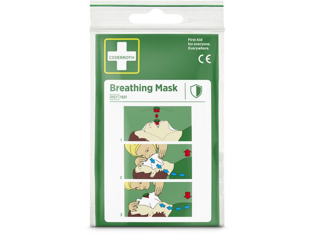Cederroth Andningsmask är ett hjälpmedel för att ge mun-till-mun-andning på rätt sätt samtidigt som det minskar risken för kontakt mellan hjälpare och skadad. Andningsmasken består av en plastduk med backventil. Tydliga instruktioner är tryckta direkt på duken. Munstyckets utformning tvingar hjälparen att gapa stort och pressa sina läppar runt den skadades mun så att det sluter tätt. Backventilen har stora hål vilket minskar motståndet och underlättar för hjälparen att orka genomföra ett längre pass konstgjord andning. Produkten är CE-märkt. Innehåll: 1 st andningsmask med backventil – CE-märkt