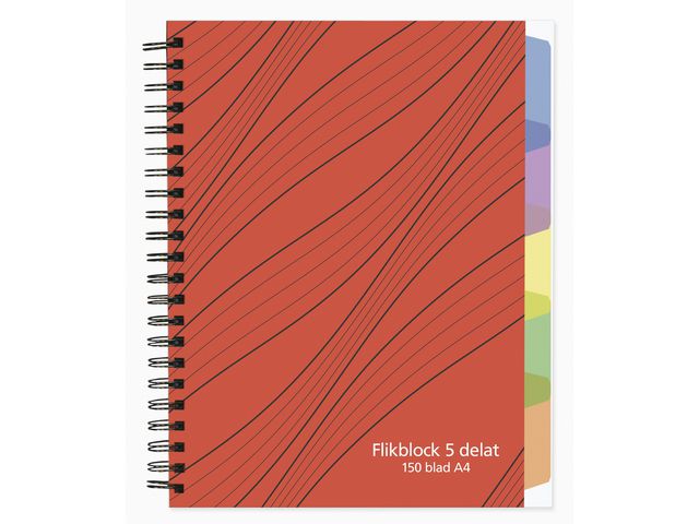 Spiralbundet med omslag i kraftig PP 157g. Olikfärgade flikar i transparent PP. 5 flikar: 150 blad (90 linjerade, 60 rutade)