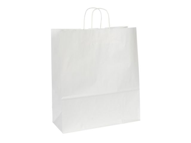 Bärkasse som finns i flera olika färger och storlekar. Fungerar även som presentpåse. Högkvalitativ papperskasse med handtag av tvinnat papper och förstärkt botten. – Mått: 400 x 160 x 450 mm – Färg: vit – FSC Mix 70 %