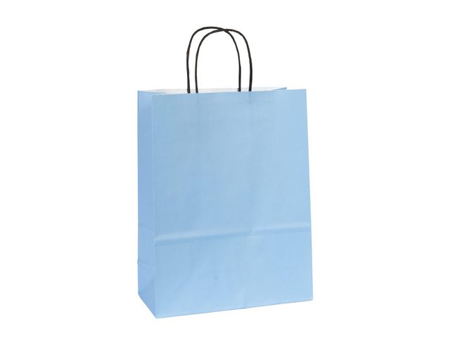 Bärkasse som finns i flera olika färger och storlekar. Fungerar även som presentpåse. Högkvalitativ papperskasse med handtag av tvinnat papper och förstärkt botten. – Mått: 240 x 110 x 330 mm – Färg:ljusblå