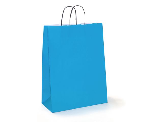 Bärkasse som finns i flera olika färger och storlekar. Fungerar även som presentpåse. Högkvalitativ papperskasse med handtag av tvinnat papper och förstärkt botten. – Mått: 180 x 80 x 225 mm – Färg: blå