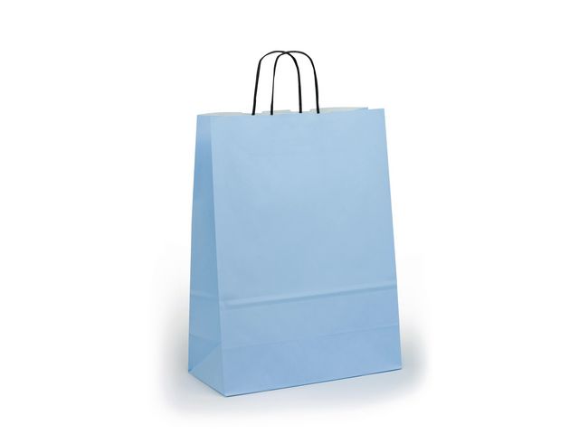 Bärkasse som finns i flera olika färger och storlekar. Fungerar även som presentpåse. Högkvalitativ papperskasse med handtag av tvinnat papper och förstärkt botten. – Mått: 180 x 80 x 225 mm – Färg: ljusblå – FSC Mix 70 %
