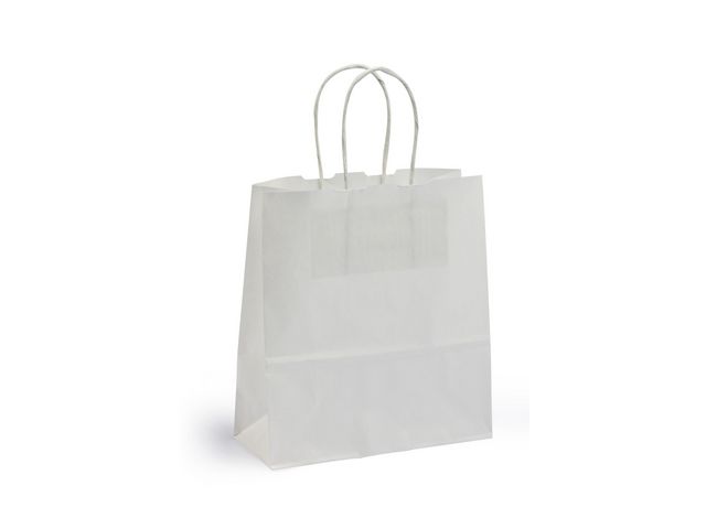 Bärkasse som finns i flera olika färger och storlekar. Fungerar även som presentpåse. Högkvalitativ papperskasse med handtag av tvinnat papper och förstärkt botten. – Mått: 180 x 80 x 225 mm – Färg: vit – FSC Mix 70 %