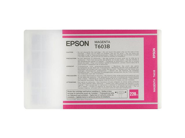 Bläckpatronen Epson T603C innehåller UltraChrome-bläck, vilket ger fantastisk bildkvalitet i alla dina foton. Välj bläckpatronen Epson T603B när du fyller på med kontorsmaterial för att få överlägsen kvalitet och resultat. Denna bläckpatron innehåller UltraChrome-bläck, vilket ger fantastisk bildkvalitet och enastående detaljrikedom i alla dina foton. Den har en hög kapacitet och är idealisk för större utskriftsvolymer i hemmet eller på kontoret. – Färg: magenta – Singelförpackning – UltraChrome-bläck – Hög kapacitet – Utformad för fotoutskrifter – Passar utmärkt hemma eller på kontoret – Volym: 220 ml – Kompatibel med: Stylus Pro 7880, 9880, 7800, 9800
