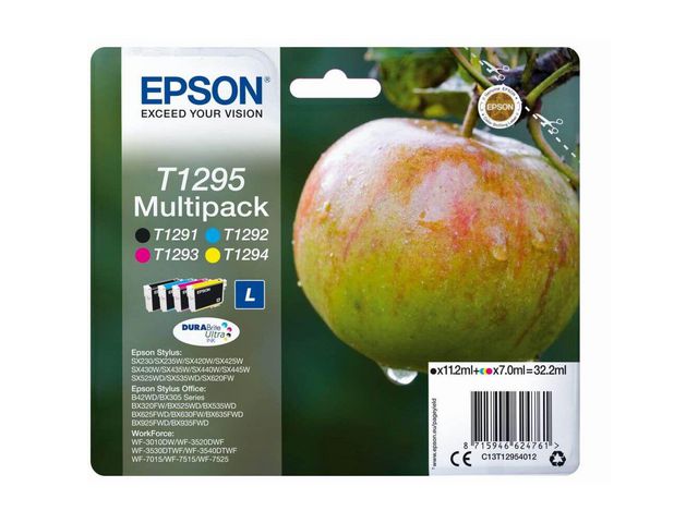 Epson T1295 DURABRite Ultra levererar klara utskrifter, oavsett om det är textdokument eller foton. Epson bläckpatroner är skapade med kvalitet och prestanda i åtanke, Epson T1295 DURABrite Ultra bläckpatron är ekonomisk och enkel att använda. Epson DURABrite Ultra serien är designad för att producera högkvalitativa dokument och livfulla bildutskrifter. Den här bläckpatronen passar bäst tillsammans med Epson-skrivare, tillsammans genererar de utmärkta utskrifter. – Modell: T1295 – Högkvalitativa utskrifter – Färg: Svart, Cyan, Gul, Magenta – Kompatibel med: Stylus : SX425 / SX525WD / BX305SF / BX320FW / BX625FWD