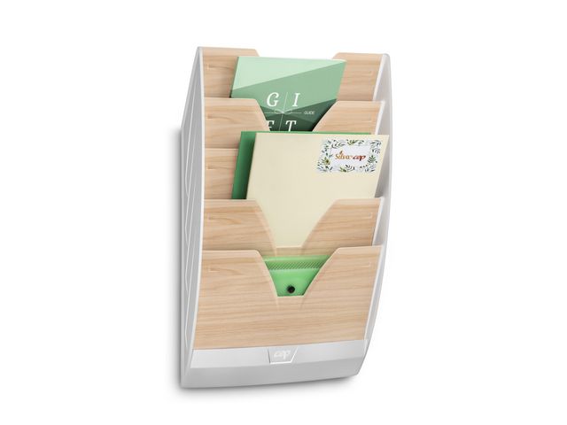 Stilren väggdisplay tillverkad som en robust, solid del med 5 fack och en snygg trämönstrad design. Den naturliga designen ger en mjuk och varm känsla på klassiskt Skandinavisk sätt. Facken är v-formade och djupa för att lätt få plats med och nå både stora och små dokument. Det översta facket har en lutning för säker förvaring av ihoprullade dokument av större storlek. Har en kapacitet för större och tjockare dokument på upp till 24x32cm, som kan förvaras både vertikalt eller horisontellt. Detta starka väggställ kan hålla tunga dokument med sin kapacitet på upp till 7kg. – Förvaringsutrymme i 1 fack: 325x24mm – Väggmonteringssats ingår