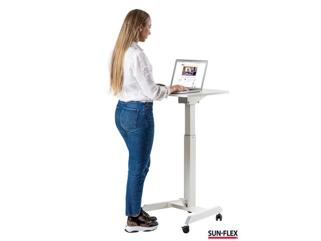 SUN-FLEX®EASYDESK PRO är ett bord som är perfekt för kontor, hemmakontor, skola och aktivitetsbaserade arbetsplatser. Designen fokuserar på fleranvändaren. Materialet är noggrant utvalt för att ge robust stabilitet och funktion. Bordet kan höjas och sänkas manuellt (758-1128 mm ) med en gasfjäder via en fotpedal, dvs helt utan vev eller elektrisk kabel. Man kan således enkelt variera mellan stående och sittande arbete.De fyra hjulen på stativet rullar smidigt och två hjul är individuellt låsbara med en knapptryckning. Bordsskivans unika konstruktion gör att den kan vinklas. Bordet kan användas som ritbord, konsolbord, bokstöd, musikställ eller som podium för föreläsningar och i klassrummet som en avtagbar kateder. – Produkt: SUN-FLEX®EASYDESK PRO – Material: Stål, MDF – Höjdjustering: 758-1128 mm – Vinklingsbart: Ja, 0-90 grader – Låsbara hjul: Ja, 2 st – Storlek bordsskiva: 60×52 cm – Garanti: 2 år – Vikt: 11 kg – Certifikat: Se www.sun-flex.com –