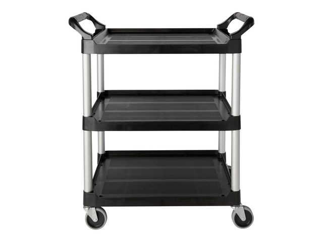 Rullvagn från Rubbermaid tillverkad av robust aluminium och konstruerad för krävande förvaring. Dess stora hyllor rymmer olika sorters utrustning, allt från rengöringsprodukter till köksredskap. Vagnen har öppna sidor vilket gör den enkel att fylla och minimerar ansträngning. Hjulen är konstruerade för ökad rörlighet, vilket gör vagnen väldigt enkel att flytta runt. De svarta hyllorna och den borstade aluminiumytan tillför ett elegant utseende som passar in i alla arbetsmiljöer. Den kan bära upp till 90 kg åt gången. – Hjul som utformats för extra mobilitet – Färg: svart och metall – Mått: 465 x 840 x 945 mm