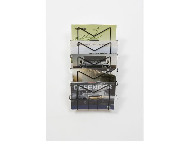 Snyggt tidningsställ av svartlackad metalltråd. Sortera broschyrer och tidningar och visa dem på ett överskådligt sätt. Svensktillverkad av svartlackad tråd. Monteras på vägg. A4 liggande. – Fackdjup 40mm. – Mått: 31,5x79cm (BxH)