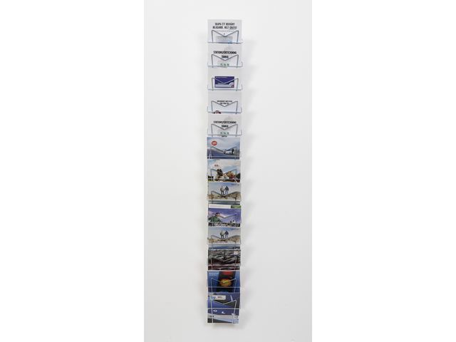 Sortera broschyrer och tidningar och visa dem på ett överskådligt sätt. Svensktillverkad av blankförzinkad tråd. Monteras på vägg. – Fackdjup 40mm. – Mått: (BxHxD) 160x1360x140mm. –
