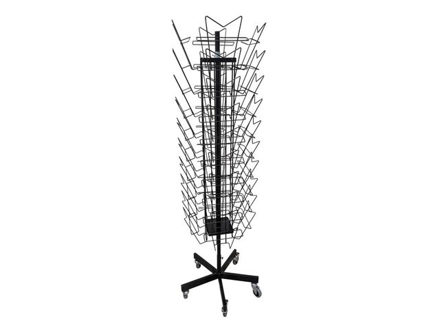 Det här broschyrstativet är utmärkt för att visa flygblad, broschyrer och annan kampanjinformation i områden med hög genomströmning. Det här broschyrstativet är utmärkt för att visa och dela ut marknadsföringsmaterial i områden med hög genomströmning, t.ex. turistattraktioner och evenemangslokaler. Det fyrsidiga stället har 10 platser på varje sida, och kan svängas för snabb och enkel bläddring. En stålbas med fem hjul ger lång hållbarhet samt enkel bärbarhet och förvaring. – Kapacitet: 40 platser – Format: A4 – Material: Lackat stål – Mått: 47 x 180 cm – Färg: Svart