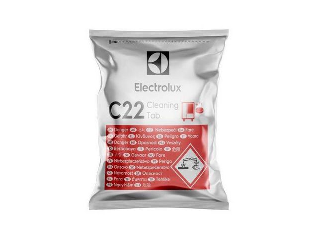 För Electrolux Professional ugnar med självrengöringssystem. Electrolux Professional C22 rengöringstabletter är särskilt framtagna för Electrolux Professional SkyLine ugnar. Regelbunden användning av av din utrustning med C22-tabletter ger hygienisk renhet ,vilket säkerställer produktprestanda och överensstämmelse med garantivillkoren. C22 rengöringstabletter är fosfatfria och högeffektiva för grundlig rengöring av feta, oljiga och inbrända rester. – Garanterar hygiensäkerhet för säker mathantering – Enkel användning med smarta doseringspåsar – Minimal miljöpåverkan tack vare nedbrytbara ingredienser – Fungerar tillsammans med Electrolux Professional C25 skölj- och avkalkning – pH-värde: ca 13 – Utseende: Vit tablett