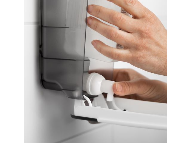 Dispenser för ett stort urval av tvålar och handdesinfektion. Den heltäckande tryckytan gör den enkel att använda för alla, punktskrift på tryckknappen. Kontrasterande färg för synlighet på väggen. Transparant bakstycke – för enklare montering. Lätt att kontrollera när den behöver fyllas, tack vare transparanta sidopaneler. Välj mellan Katrins skumtvål, flytande tvål, duschtvål och desinfektion 1000ml. Alla tvålar finns med eller utan doft, välj mellan Sunny Garden, Arctic Breeze och Pure Neutral. Material, ABS (Acrylonitrile butadiene styrene), PC (Polycarbonate), POM (Polyoxymethylene). – Längd: 125mm – Djup: 100mm – Höjd: 290mm