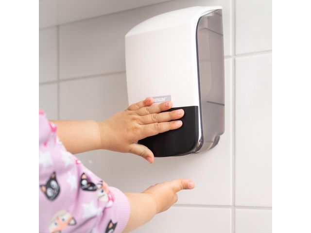Dispenser för ett stort urval av tvålar och handdesinfektion. Den heltäckande tryckytan gör den enkel att använda för alla, punktskrift på tryckknappen. Kontrasterande färg för synlighet på väggen. Transparant bakstycke – för enklare montering. Lätt att kontrollera när den behöver fyllas, tack vare transparanta sidopaneler. Välj mellan Katrins skumtvål, flytande tvål, duschtvål och desinfektion 500 ml Alla tvålar finns med eller utan doft, välj mellan Sunny Garden, Arctic Breeze och Pure Neutral. Material, ABS (Acrylonitrile butadiene styrene), PC (Polycarbonate), POM (Polyoxymethylene). – Längd: 125mm – Djup: 100mm – Höjd: 205mm