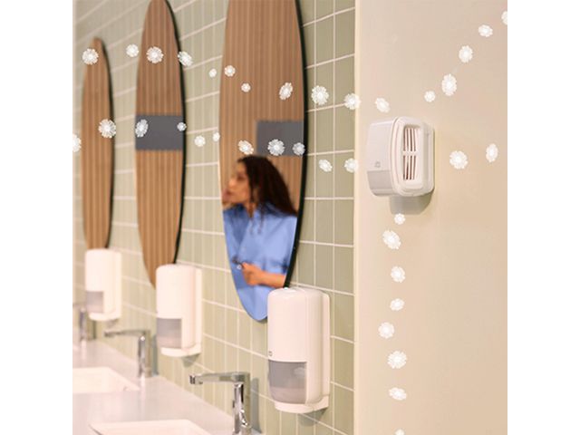 Levererar en konstant doft som skapar en behaglig miljö i toalettutrymmen. Den unika, högteknologiska distributionsteknologin* doserar parfym kontinuerligt för en varaktig doft som inte försvinner direkt efter sprayning. Airfreshenern eliminerar lukter samtidigt som den ger en behaglig doft, och du kan ställa in intensiteten efter önskemål. Det är en automatisk airfreshener som kan placeras på lägre höjd än traditionella spraysystem, och den är certifierat Easy to use av Svenska Reumatikerförbundet, vilket förenklar påfyllning och underhåll. Välj mellan tre dofter: fräsch Bris, blommig Blomster eller diskret odörneutraliserande (refill köps separat). *Patenterad teknologi baserad på beprövad bränsleteknik som används inom läkemedelsindustrin, där exakta doser är viktiga vid behandling av människor och djur. Kompatibel med Tork A3 refiller. – Konstant och jämnt fördelad dosering – Långvarig doft – System som är enkelt att använda – Lättåtkomlig placering – Refiller utan drivgas – Mått: B98xH146xD119