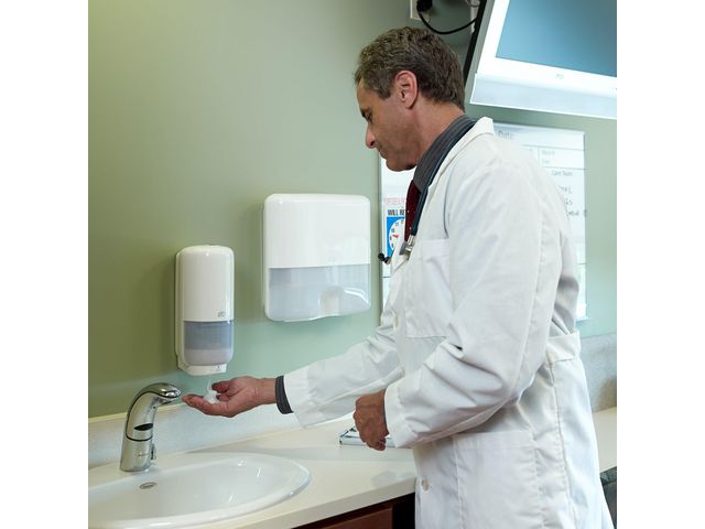 Tork dispenser med modern design och automatisk dosering. Tork Dispenser för skumtvål –  Intuition sensor i Elevation design ger dig möjlighet att göra ett gott intryck på dina gäster. Sensordriven, beröringsfri utmatning minskar risken för korskontaminering. Dispensern kan användas med ett stort urval av Tork hudvårdsprodukter i förslutna flaskor. Beröringsfri dosering säkerställer god handhygien för alla besökare. Elevation dispensrar har en funktionell och modern design som skapar ett långvarigt intryck hos dina besökare. Dispensern är lätt att fylla vilket sparar dig tid, varje gång. Kompatibel med Tork S4 refiller, 1 liters. – Enkelt underhåll med LED-nivåindikator som visar när påfyllning behövs – Garanterat problemfri rengöring och intuitiv påfyllning sparar tid – Sensoraktiverad – ger ett högteknologiskt intryck – Intuition sensor för beröringsfri utmatning. – Certifierad enkel påfyllning av Svenska Reumatikerförbundet – Fönster på båda sidor – för att lätt kunna se när refillflaskan behöver bytas ut – Tork Intution Sensitive S4 – Färg: Vit