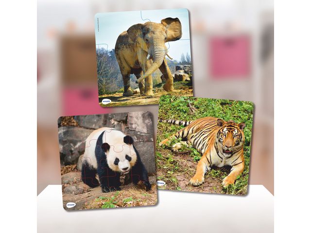 Set med tre olika pussel. Varje pussel har olika antal bitar för olika svårighetsgrader. På varje pussel visas en bild av ett utrotningshotat djur. 100% TPE (termoplastisk elastomer – en böjlig och återvinningsbar plast). Pussel är ett bra sätt att lära sig koordination och problemlösning. – Storlek: 21×21 cm – Material: 100% TPE (termoplastisk elastomer – en böjlig och återvinningsbar plast) – En förpackning innehåller 3 pussel (6/12/25 bitar) samt 1 broschyr – Rekommenderad ålder: från 3 år – Varning. Lämpar sig inte för barn under 3 år – CE