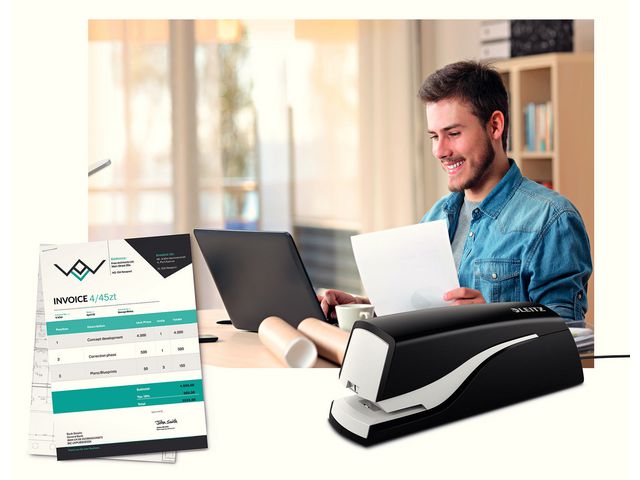 Häfta ihop viktiga dokument och håll ordning på dem på ett ställe med den lättanvända elektriska häftapparaten 5532 från Leitz®. Den elektriska häftapparaten 5532 från Leitz® kan användas med en hand, vilket gör den till ett effektivt och praktiskt verktyg. Den kan häfta upp till 10 ark papper, med en tjocklek på 80 g/m². Dessutom kräver det här verktyget ingen extra elektrisk stabilisering, eftersom den kan drivas via elnätet på kontoret eller i hemmet. – Kompatibel med Leitz® e1-klamrar – Innefattar adapter och 1 000 x e1-klamrar – Kan användas med en hand – Drivs via elnätet – Kapacitet: 10 ark – Färg: Svart