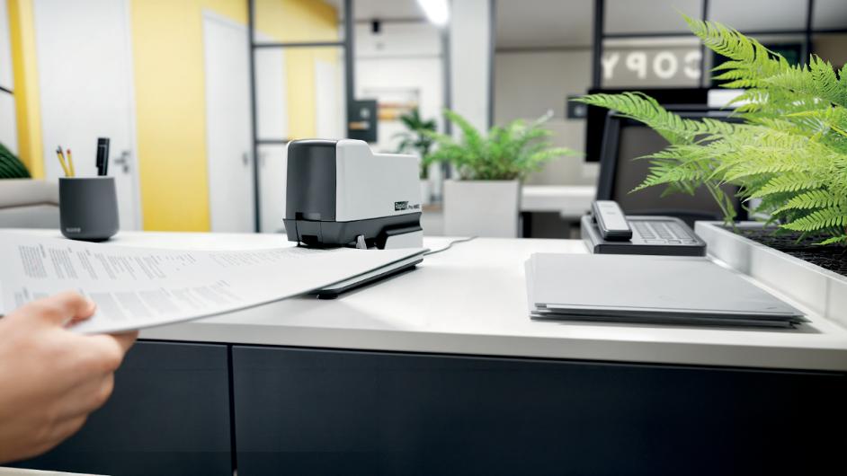 Enkel, slitstark och ljudsvag häftapparat med frontladdning och säkerhetsfunktion. Variabelt gapdjup upp till 6,0 cm från kanten. Levereras med ljuddämpande skumgummi undertill samt adapter. 2 års garanti vid användning med häftklammer från Rapid. – Laddningskapacitet: 210 häftklammer av typen 66/6 eller 66/7 – Häftkapacitet: upp till 30 ark åt gången – Mått: HxBxL 11,8 x 11,3 x 24,5 cm – Vikt: 1,9 kg – Gapdjup: 5/30mm
