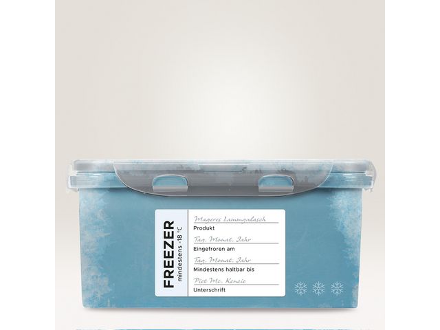 Averys frysetiketter är idealiska för märkning och organisering av kyl- och frysvaror. Averys frysetiketter är idealiska för märkning och organisering av kyl- och frysvaror i kylrum och frysar där man måste ha synlig och tydlig information om hållbarhet m.m. När du använder Averys frysetiketter är du garanterad en hållbar märkning som också kan spara dig tid eftersom innehåll och annan varuinformation är tydlig både under infrysning och efter upptining. De är främst avsedda för frys- och fiskeindustrin, slakterier, gårdsbutiker, laboratorier och sjukhus, men kan naturligtvis även användas i hemmet. Tillverkade av köldbeständigt papper med stor vidhäftningsförmåga och de kan också fästas på ytor med lätt rimfrost och tål direktkontakt med torra, icke-fetthaltiga livsmedel. Minsta temperatur vid applicering är –20 °C med användningstemperatur från –50 °C till +70 °C. Etiketterna kan skrivas ut på alla svart/vita- och färglaserskrivare samt bläckstråleskrivare. Du kan enkelt – och helt gratis – designa och skriva ut dina Avery-produkter med Avery Design & Print, som innehåller mallar, grafik och designmöjligheter. Läs mer om mjukvaran här: www.www.avery.se/software. – Mått: 38,1 x 21,2 mm – Antal: 65 etiketter/ark och 1 625 etiketter/förpackning – FSC-Mix