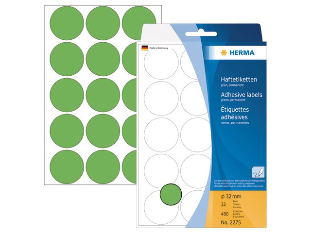 Praktiska runda allroundetiketter från Herma. Perfekta för organisering, planering, märkning m.m. De är självhäftande och enkla att skriva på med valfri penna eller skrivmaskin. Etiketterna med markeringsprickar från Herma är PEFC-certifierade. – Permanenta etiketter – Kan skrivas på – Ej kompatibla med bläckstråle- eller laserskrivare – Högkvalitativt, klorfritt blekt papper – Använder klister utan lösningsmedel – Form: rund – Diameter: 32 mm – Färg: grön – Antal: 480 etiketter, 15 x 32 ark – FSC Mix