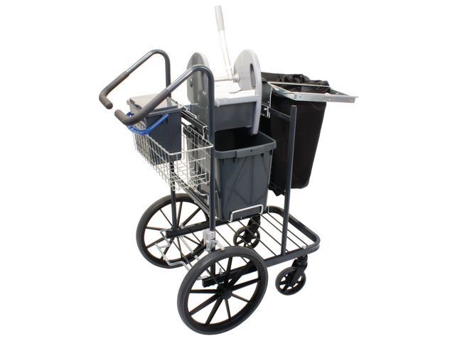 Fastighetsvagn som är extremt robust och tålig, anpassad för utomhusbruk. 400 mm bakhjul samt 150 mm framhjul. Vagnen är välbalanserad och lättmanövrerad vilket gör det enkelt att använda den utomhus. Komplett svabbutrustning. Tröskelklättrare. Extra stor tvättpåse. Handmanövrerad parkeringsbroms. Plats för 1 stativ. Krokar. – Mått (LxBxH): 985x560x1260mm – Svensktillverkad