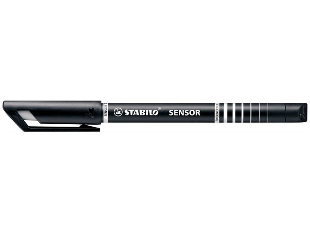 Finelinerpennan STABILO® sensor® är perfekt för de som skriver regelbundet eftersom dess mjuka spets som gör skrivandet oerhört bekvämt. Denna STABILO® finelinerpenna med en unik metallinkapslad spets med dämpning som anpassar sig till olika skrivtryck är perfekt för daglig användning. Den rundade aluminiumkroppens eleganta utseende kompletteras av en ventilerad kork med en praktisk fickklämma så att du kan bära den med dig. STABILO® sensor® har en supertunn spets som inte böjs eller bryts av så att du kan skriva avslappnat och bekvämt. Den långa spetsen gör den här finelinern enkel att använda tillsammans med en linjal eller geometriredskap. – Huv – Linjebredd: 0,3 mm – Textfärg: Svart – Färg pennkropp: Svart – Vattenbaserat bläck