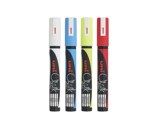 uni® griffelpennor finns i fyra snygga färger och är perfekta för användning på icke-porösa ytor, som till exempel metall, glas och whiteboard. Uni® griffelpennor är vattenbaserade och kan enkelt torkas bort med en fuktig trasa. Du kan markera på glasfönster, speglar, whiteboardtavlor och andra metallytor med märkpennorna. Dessa märkpennor kommer väl till pass på caféer, pubar och restauranger för att skriva menyn på whiteboardtavlan, skapa vackra konstverk på fönstren eller för att skriva ned offerter. De kan användas för att skapa välkomstskyltar och ställas utanför kaféer, eftersom skriften inte blir urblekt i regn. – Lämplig för användning på icke-porösa ytor, till exempel metall, glas och whiteboard – Vattenbaserat och kan enkelt torkas bort med en fuktig trasa – Spets: 1,8 till 2,5 mm – Färger: Blandade – Antal: 4