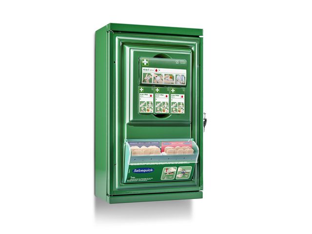 Första Hjälpen-skåp särskilt anpassat för arbetsplatser med utsatt miljö, t ex smuts, damm och fukt. Lämpar sig på platser där det finns anledning att ha en mer omfattande Första Hjälpen-utrustning. Första Hjälpen-skåp Mini är ett mindre plåtskåp med Cederroth lilla Första Hjälpen-tavla monterad på dörren. I det låsbara skåpet förvaras påfyllningsartiklar. Produkten är CE-märkt. Innehåll: 1 ask (6×45 st) Plastplåster 1 ask (6×40 st) Textilplåster 1 st Skyddspaket 1 st Cederroth 4-in-1 Blodstoppare 1 st Cederroth 4-in-1 mini Blodstoppare Sax och Pincett – Mått (BxHxD): 26 x 44 x 17 cm – CE-märkt