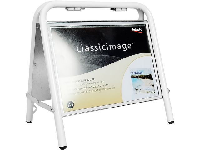 Klassiskt mäklarställ i A3 format. Enkelt att byta budskap, frontplast ingår. Finns en ögla nertill till som gör att du kan kedja fast stället.