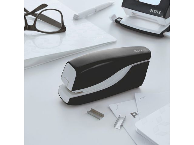 Liten elektrisk häftapparat för små dagliga utmaningar. Inte större än en vanlig manuell häftapparat. Använder 4 st AA-batterier (medföljer ej). – Mått: HxBxD 6,5 x 5 x 15,3 cm – Gapdjup: 1 cm – Laddningskapacitet: 100 häftklammer av typen E-1