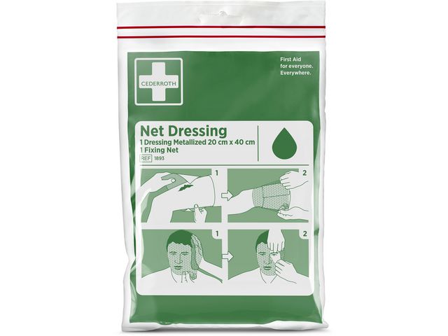 Huvudförband som är avsedd för skador på huvudet, men är lämpligt även för att lägga förband på armar och ben. Ett sterilt förband med metalliserad yta som inte fastnar i sår. Förbandet hålls på plats genom ett tubformat elastiskt fästnät. Produkten är CE-märkt. Innehåll: Påse med 1 kompress 20 x 40 cm samt 1 fästnät – CE-märkt