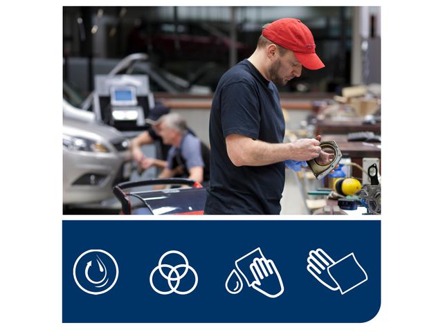 Hållbart avtorkningspapper – förblir tåligt även när det är vått. Rengör ytor och skydda händerna från hög värme och metallspån med Tork Avtorkni...