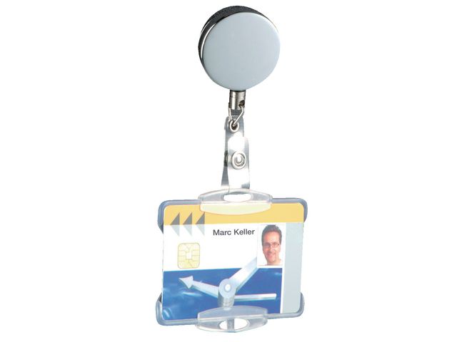 Med jojon DURABLE kan du sätta fast namnskyltar och ID-kort och hålla dem på plats. Den robusta jojon DURABLE är ett snyggt och praktiskt kontorstillbehör, eftersom den håller ID-kort som namnskyltar och passerkort på plats. Jojon är utdragbar till 80 cm för att ge snabb och enkel åtkomst till kort eller brickor. Dessutom har den en metallklämma som kan fästas i bältet eller skjortfickan. Tillverkad av PVC. – Håller ID-kort och namnskyltar på plats – Extra starkt snöre – Utformad för att hålla länge – Har en metallklämma som kan fästas på alla klädesplagg – Jojon är utdragbar till: 80 cm – Färg: silverkrom
