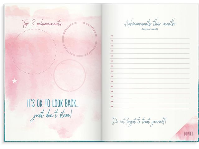 Inbunden odaterad kalender med rosa märkband och hårt omslag i kartong. Ett planeringsverktyg för att uppnå sina drömmar och mål. Kalendern innehåller sidor med inspirerande citat plats för mål reflektioner och anteckningar. Skriv ner års- och månadsmål. Efter varje månadsslut finns en sida för utvärdering av månaden som gått. Cremefärgat papper. Engelsk inlaga. – Format: 163×229 mm. – Layout: Liggande. Vecka/Uppslag. – Omslag: Kartong. Inbunden. – Detaljer: Gummiband. Märkband. – Antal sidor: 256. – Pappersvikt: 100 g. – FSC