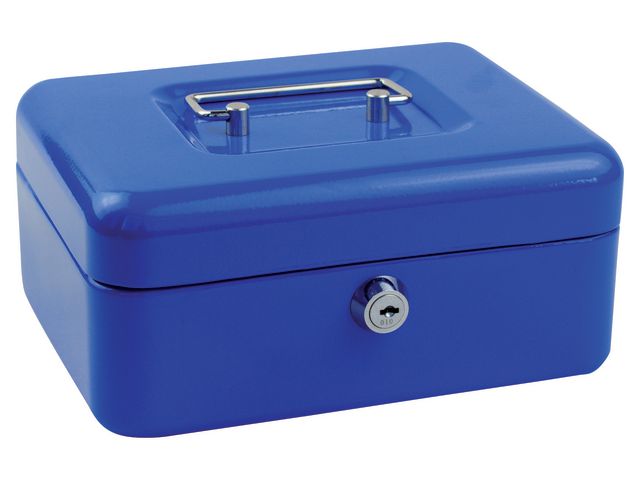 Blått kassaskrin med 5-delad svart myntbricka. Metallens tjocklek: 1 mm Mått: HxBxD 9 x 20 x 16 cm – Ett klassiskt, litet, blått kassaskrin – – Med cylinderlås – – 5-delad myntbricka