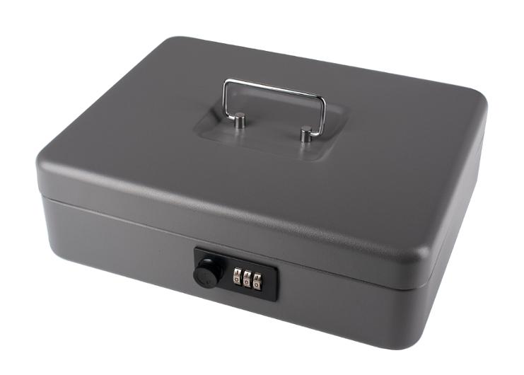 Säkert kassaskrin med kombinationslås och myntlåda som är uttagbar. Förvara dina kontanter säkert i ett kassaskrin. – Mått: 240x300x90mm – Färg: Mörkgrå – Matt yta – 0,8mm stål