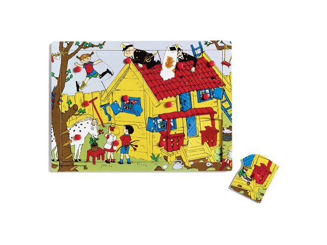 Pussla ihop Villa Villekulla! Bitarna i detta träpussel har små knoppar att hålla i. I pusslets ram finns bilden av huset och trädgården men utan Pippi och hennes kompisar, de finns på pusselbitarna! När du lägger pusslet får Villa Villekulla och trädgården liv och rörelse av Pippi, Tommy, Annika och de andra. Detta finurliga träpussel blir en succé hos alla barn som gillar Pippi Långstrump. Illustration av Ingrid Vang Nyman. – Material: Plast och trä – Antal bitar: 12 stycken – Mått: 21x30x0,9 cm – Rekommnederad ålder: från 18 månader – FSC – CE