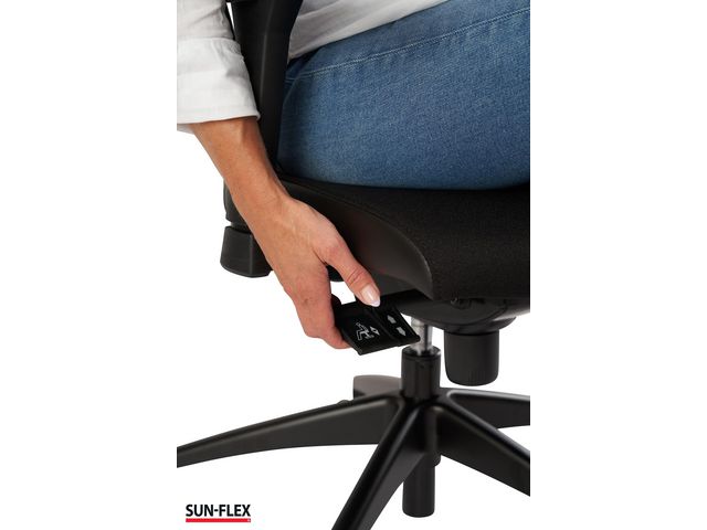 När du väljer SUN-FLEX OFFICECHAIR HB väljer du samtidigt hållbarhet, modern design och exceptionell komfort, helt utan kompromisser. Denna modell kombinerar ergonomi med intuitiv design för att ge dig optimalt stöd, vilket säkerställer en korrekt sittställning genom hela arbetsdagen. Sitsen och ryggstödet fungerar oberoende av varandra, vilket skapar en skräddarsydd komfort. Justera enkelt stolen till dina behov och känn genast den påtagliga skillnaden när du sätter dig. Tyget är Oeko-Tex Certifierat. – Justerbara armstöd – Höj-och sänkbar – Pump till svankstöd – Justerbart nackstöd – Tyget är Oeko-Tex certifierat – Belastningskapacitet: 120 kg