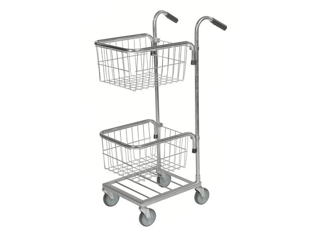 Mindre vagn för många användningsområden såsom kontor, skola och butik. Med elzinkat stativ och fyra länkhjul. De praktiska korgarna är justerbara i höjd. Levereras omonterad. – Belastning: 35 kg – Mått 660 x 385 x 1090 mm – Hylldimensioner: 410 x 355 mm (LxB) – Hjultyp: 4 länk – Bromsade hjul: nej – Vikt vagn: 12,5 kg – 25 % Post-consumer återvunnet material