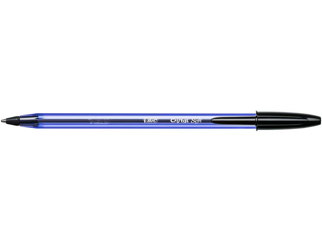 Med en transparent blå pennkroppsdesign ger den här svarta BIC® Cristal® Soft upp till 35% jämnare skrift än BIC® originalkulspetspennor. Cristal® Soft har en kulspets i hårdmetall som är otroligt stark och gör det behagligt att skriva tack vare den perfekta klotformen. Högklassigt, snabbtorkande bläck som ger snygg och kladdfri skrift. Varje penna har en stor spets på 1,2mm. – Pennan är PVC-fri – Huv – Spetsbredd: 1,2 mm – Skrivfärg: Svart – Färg pennkropp: Transparent – Dokumentäkta bläck enligt ISO 12757-1 och 12757-2