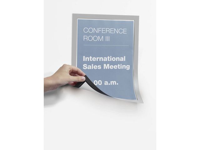 Använd magnethäftande inforamar DURAFRAME MAGNETIC för att visa och presentera användarinstruktioner, maskinfakta, medarbetarinformation och annan tillfällig eller mer varaktig information på ett professionellt sätt. Lägg det skyddande arket, med magnetiskt fäste längs ramens kant, över dokumentet och sätt upp på exempelvis whiteboardtavlor, omklädningsskåp och metallväggar. Snyggare och enklare hantering än t ex tejp. – För dokument i A4 format – Yttermått 236×323 mm – Färg: silver – Förpackning med 5 st