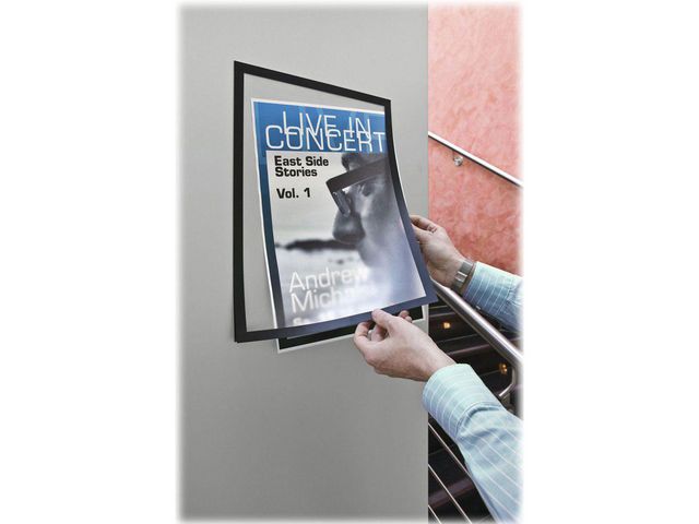 Lättanvänd, självhäftande inforam för att visa olika typer av information på ett stilfullt sätt. För affischer och dokument i A3 format. Använd självhäftande DURAFRAME® inforamar för att visa och presentera kampanjerbjudanden, öppettider, skyltar och annan tillfällig eller mer varaktig information på ett professionellt sätt. Enkelt att sätta i eller skifta budskap genom att lyfta framsidan med magnetstängning. Lätt att sätta upp – utan verktyg eller andra tillbehör – på fasta och släta ytor. Snyggare och enklare hantering än t ex tejp, häftstift eller häftklammer. Ramen ser likadan ut på fram och baksidan, vilket är bra när den placeras på glasrutor för dubbelsidigt budskap. Ramen går att ta bort från glasrutor. Undvik att fästa självhäftande DURAFRAME® på målade, belagda eller laminerade ytor samt underlag som tapeter, porösa material och non-stick ytor då ytorna kan skadas om ramen tas bort. Tillverkad av PVC. – För dokument i A3 format – Transparent framsida av tålig plast – Yttermått 325x 445 mm. – Färg: Svart (1,5 cm bred ram) – Antal: 2