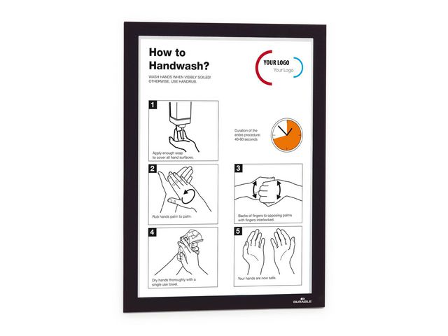 Lättanvänd, självhäftande inforam för att visa olika typer av information på ett stilfullt sätt. För dokument i A4 format. Använd självhäftande DURAFRAME® inforamar för att visa och presentera kampanjerbjudanden, öppettider, skyltar och annan tillfällig eller mer varaktig information på ett professionellt sätt. Enkelt att sätta i eller skifta budskap genom att lyfta framsidan med magnetstängning. Lätt att sätta upp – utan verktyg eller andra tillbehör – på fasta och släta ytor. Snyggare och enklare hantering än t ex tejp, häftstift eller häftklammer. Ramen ser likadan ut på fram och baksidan, vilket är bra när den placeras på glasrutor för dubbelsidigt budskap. Ramen går att ta bort från glasrutor. Undvik att fästa självhäftande DURAFRAME® på målade, belagda eller laminerade ytor samt underlag som tapeter, porösa material och non-stick ytor då ytorna kan skadas om ramen tas bort. Tillverkad av PVC. – För dokument i A4 format – Yttermått 236×323 mm. – Ram: 1,5 cm svart ram – Antal: 2