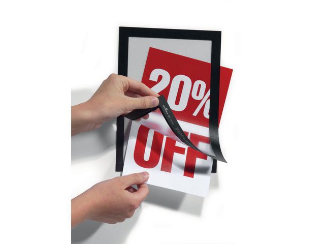 Lättanvänd, självhäftande inforam för att visa olika typer av information på ett stilfullt sätt. För dokument i A5 format. Använd självhäftande DURAFRAME® inforamar för att visa och presentera kampanjerbjudanden, öppettider, skyltar och annan tillfällig eller mer varaktig information på ett professionellt sätt. Enkelt att sätta i eller skifta budskap genom att lyfta framsidan med magnetstängning. Lätt att sätta upp – utan verktyg eller andra tillbehör – på fasta och släta ytor. Snyggare och enklare hantering än t ex tejp, häftstift eller häftklammer. Ramen ser likadan ut på fram och baksidan, vilket är bra när den placeras på glasrutor för dubbelsidigt budskap. Ramen går att ta bort från glasrutor. Undvik att fästa självhäftande DURAFRAME® på målade, belagda eller laminerade ytor samt underlag som tapeter, porösa material och non-stick ytor då ytorna kan skadas om ramen tas bort. Tillverkad av PVC. – För dokument i A5 format – Yttermått 236×176 mm – Färg: Svart – Antal: 2