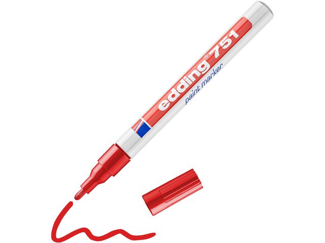 Märkpennan Edding 751 har en täckande lackfinish och ger ett jämnt resultat på många olika ytor. Den här märkpennan innehåller permanent pigmentbläck som tål vatten och slitage, vilket gör den perfekt när bläcket kommer att utsättas för vatten. Bläcket tål även temperaturer upp till 400 °C. Märkpennan Edding 751 har en tunn spets med 1 – 2 mm linjebredd och är lämplig för exakt och noggrann skrift. Den ger ett täckande resultat och har lång hållbarhet, särskilt på mjuka, porösa och mörka ytor. Märkpennan kan användas på många olika ytor, till exempel plast, metall, glas och trä. Det speciella bläcket innehåller varken xylen eller toluen, vilket innebär att märkpennan inte avger några starka lukter. Pennkroppen har en lätt design i aluminium, vilket gör det bekvämt och enkelt att skriva med märkpennan. – Permanent bläck – Med huv – Rund spets – Linjebredd: 1–2 mm – Textfärg: Röd