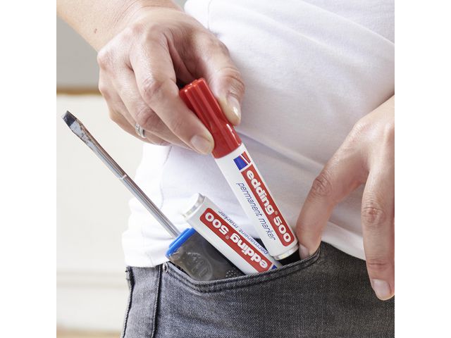 Den permanenta märkpennan Edding 500 är utformad för mångsidig användning och kan användas på nästan alla slags ytor. Den här permanenta märkpennan innehåller bläck som torkar snabbt och är smetfritt och vattenbeständigt, vilket hjälper dig att skriva tydligt och fläckfritt. Den är speciellt utformad för mångsidig användning och kan användas i flera olika sammanhang. Den permanenta märkpennan Edding 500 har en bred, snedskuren spets som ger 2 – 7 mm linjebredd och den passar utmärkt när du vill ha fet och flödande text. Märkpennan kan användas på nästan alla slags ytor, bland annat plast, metall, glas och trä. – Permanent bläck – Med huv – Snedskuren spets – Linjebredd: 2–7 mm – Textfärg: Röd