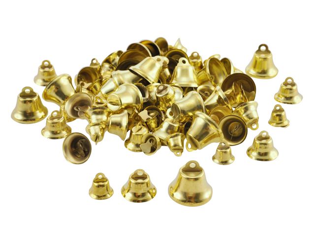 Guldfärgade klockor i tre olika storlekar. Sy på klockorna på figurer, tyg eller varför inte ett kort. Dessa pysselbjällror har en liten ögla upptill, vilket är användbart för upphängning med eller tråd eller snöre. Eftersom dessa bjällror är tillverkade av mässing har de ett elegant utseende och är beständiga mot korrosion. De finns i olika storlekar så att du kan personanpassa dina hantverk. Fördelning: 26 mm = 20 st 21 mm = 30 st 15 mm = 50 st – Antal: 100/FP – Med små öglor – Material: Mässing – Mått: 15 mm, 21 mm och 26 mm – CE-märkt