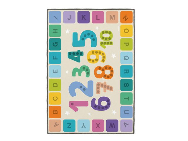 Samlingsmatta med bokstäverna A-Z och siffrorna 1-10 i glada färger. Pedagogisk matta där barnen på ett aktivt sätt kan lära sig känna igen bokstäverna, – Mått: 200x300cm – Material: 100 % polyester – PVC-fri.